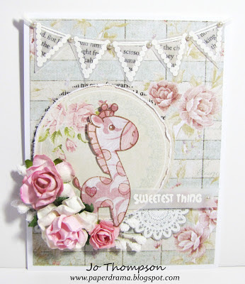 To add some more girlyness to this card, I used some pink/white flowers from I Am Roses and also added some white stamens. Another piece I added from my stash of scraps was this embossed doily stamp image.