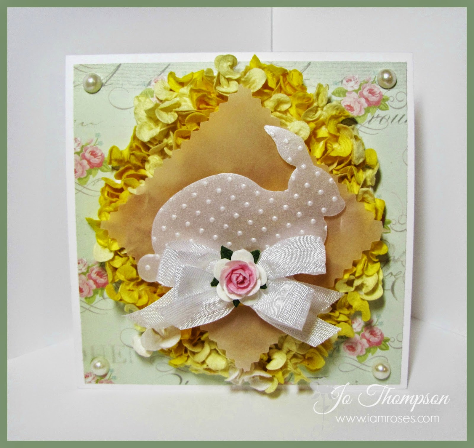 Hey it's me again =) Here is my card for the I Am Roses April Challenge. The theme is Easter and the challenge is to incorporate an Egg or Egg Shape. I decided to cut an oval shape for the egg and then I used Small Gardenia Curly Petals to fill in the shape. The petals came in different shades of yellow and also white. I love how full and fluffy it is.