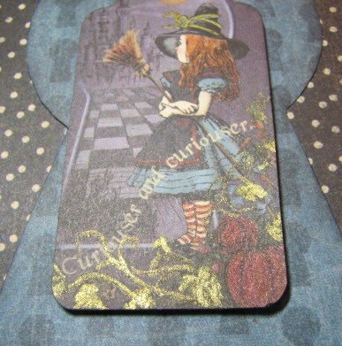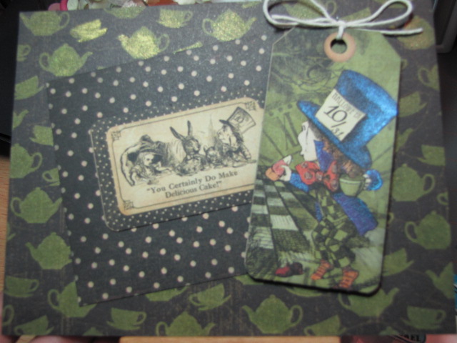 In this card, I colored the Mad Hatter's hat, his coat and his socks. Also the tea pots in the background were lightly colored with Ponderosa Pine. These pictures don't give these mica powders justice. When they catch the light at the right angle the images come to life.