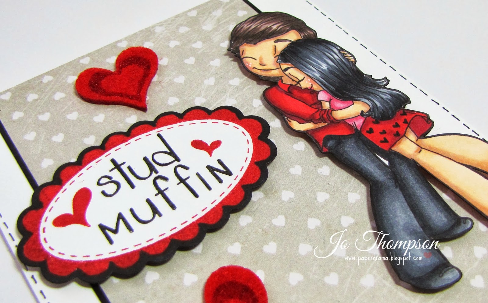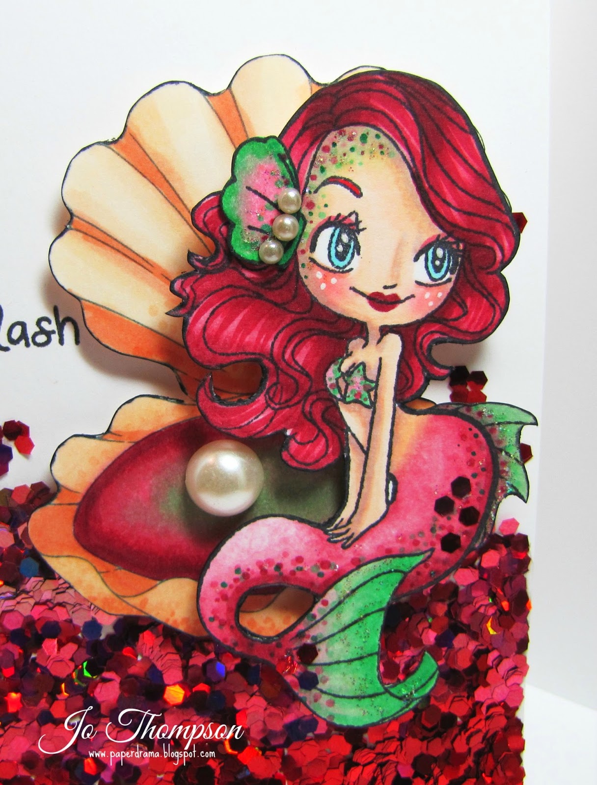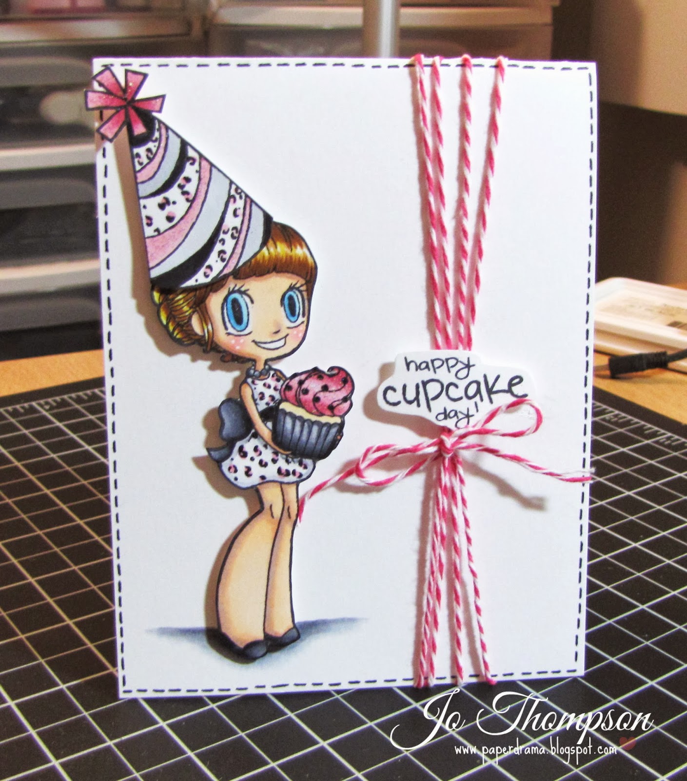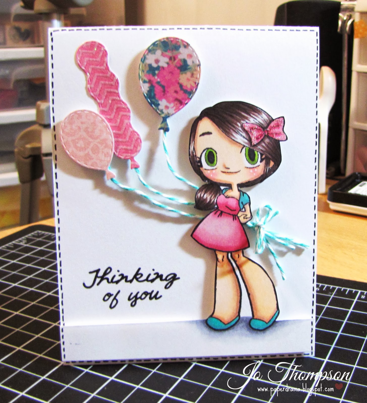 I colored her with Copic Markers and used Wink of Stella - Clear pen on top of her eye shadow. The paper I used is from Echo Park - This & That. I used wood veneer scallop border and some glitter twine. I used some alpha stickers from Thickers (oldie but goodie) to spell out "Hi". I used a trio of I Am Roses Flower for an embellishment.